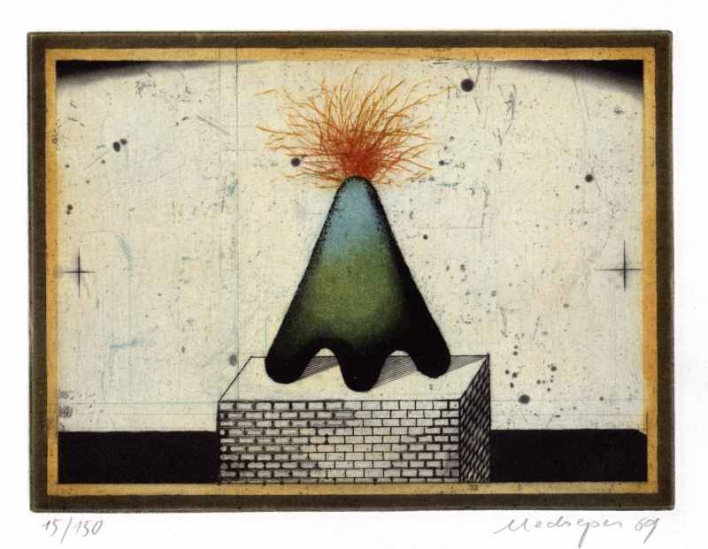 116. Champos 1969 Format: 12 x 16 cm Strichätzung, Kaltnadel, Aquatinta auf Kupfer.3 Platten, 3 Farben: rotgelb, blau, schwarz. Auflage: 150 + XXX numerierte und signierte Exemplare. Druck: Herbert Jaeckel, Worpswede Verlag: Galerie Schmücking, Braunschweig Beilage (zusammen mit Katalognummer 115) für die Vorzugsausgabe des Werkverzeichnisses der Radierungen 1956 - 1969. Erschienen 1969 im Verlag der Galerie Schmücking, Braunschweig. Zusätzlich existieren 4 unterschiedliche, signierte Zustandsdrucke. |