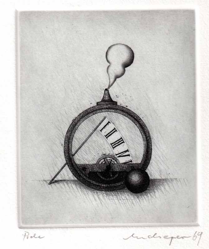 119. Uhr 1969 Format: 12 x 10 cm Strichätzung, Vernis mou, Aquatinta auf Kupfer.1 Platte,schwarz-weiss. Auflage: 100 + XX numerierte und signierte Exemplare. Druck: Herbert Jaeckel, Worpswede Verlag: Kestner- Gesellschaft, Hannover Erschienen zur Ausstellung der Kestner- Gesellschaft, Hannover, 1969. |