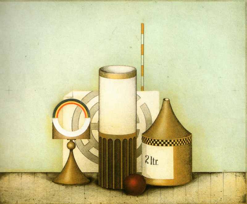 124. Blaues Stilleben 1970 Format: 50 x 60 cm Vernis mou, Roulette, Kaltnadel, Aquatinta, Sandpapier auf Kupfer.3 Platten, 4 Farben: gelb,rot, blau, schwarz. Auflage: 100 numerierte und signierte Exemplare. Druck: Druckgrafik Kätelhön, Wamel Zusätzlich existieren 10 unterschiedliche, monogrammierte Zustandsdrucke. |