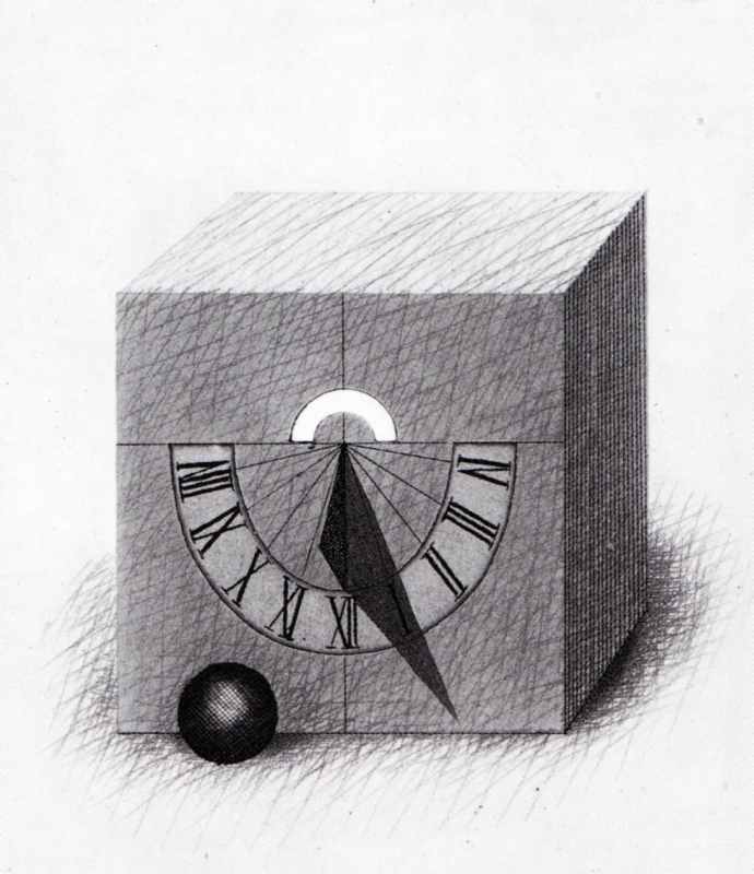126. Sonnenuhr 1970 Format: 15 x 13.5 cm Strichätzung, Vernis mou, Kaltnadel, Aquatinta auf Kupfer.1 Platte, schwarz-weiss. Auflage: 500 numerierte und signierte Exemplare. Druck: Herbert Jaeckel, Worpswede Verlag: Galerie Brockstedt, Hamburg Fest eingebundene Beilage des Auststellungskataloges der Galerie Brockstedt, Hamburg, 1970. Als Dokumentation zur Entstehung der Radierung existieren 6 unterschiedliche, signierte Zustandsdrucke. |