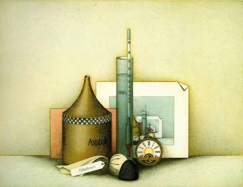 131. Stilleben mt Radierzubehör 1971 Format: 42 x 55 cm Strichätzung, Kaltnadel, Aquatinta, Vernis mou, Roulette, Sandpapier auf Kupfer.4 Platten, 4 Farben: gelb, rot, blau, schwarz. Auflage: 100 + XXXV numerierte und signierte Exemplare Druck: Druckgrafik Kätelhön, Wamel Verlag: Galerie Schmücking, Braunschweig Die römisch numerierten Exemplare erschienen zusammen mit 11 Zustandsdrucken (131a - 131k) und der Katalog Nr. 132 als das Mappenwerk "Eine Radierung". Entstehung der Farbradierung Stilleben mit Radierzubehör in zwölf Zuständen. Erschienen 1971 im Verlag der Galerie Schmücking, Braunschweig. |