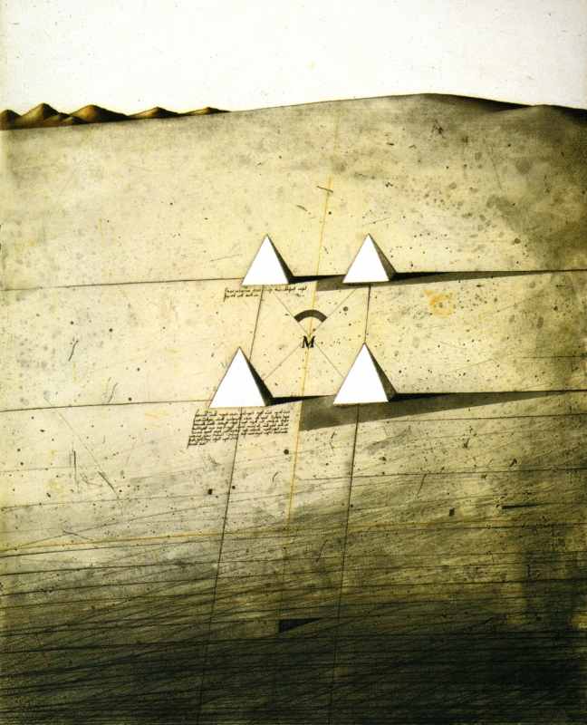 134. Vier Pyramiden 1971 Format: 58 x 47 cm Strichätzung, Kaltnadel, Aquatinta, Roulette auf Kupfer.2 Platten, 2 Farben: gelb, schwarz. Auflage: 100 + XX numerierte und signierte Exemplare Druck: Willy Steinert, Weingarten Verlag: Edition Rothe, Heidelberg |