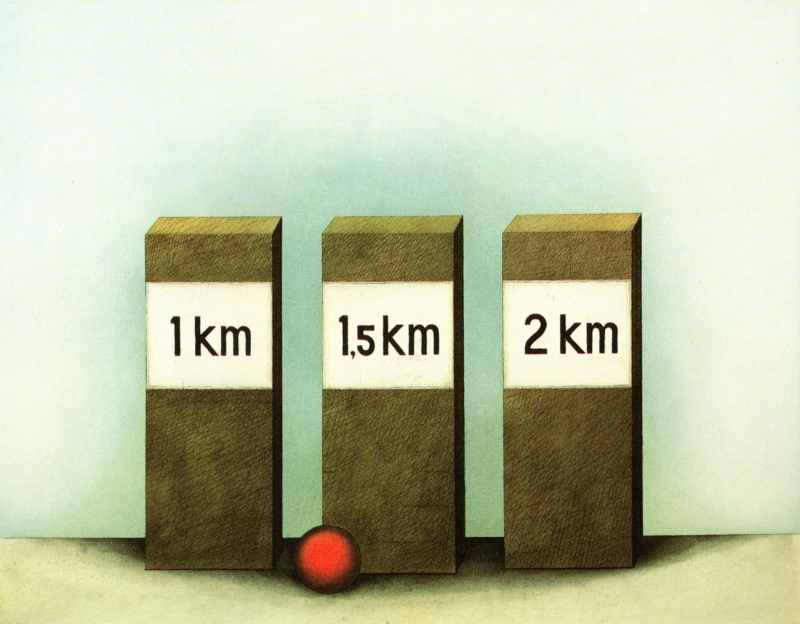 140. Drei Kilometersteine 1972 Format: 48 x 60 cm Vernis mou, Kaltnadel, Aquatinta, Roulette, Sandpapier auf Kupfer3 Platten, 4 Farben: gelb, rot, blau, schwarz . Auflage: 100 + XXV numerierte und signierte Exemplare Druck: Druckgrafik Kätelhön, Wamel |