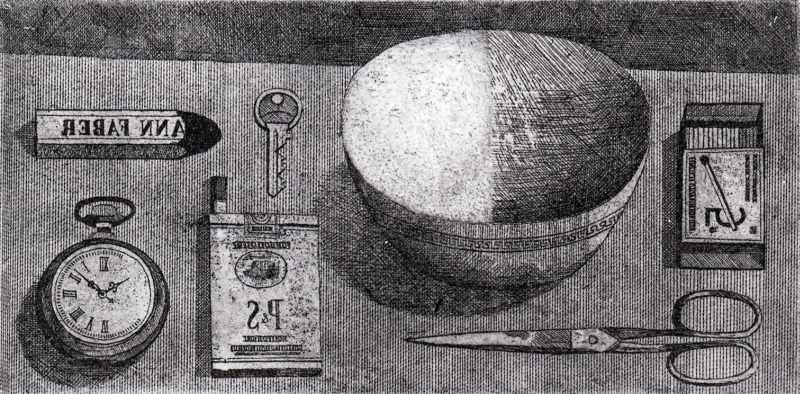 015. Stilleben 1957 Format: 11 x 21.5 cm Strichätzung auf Zink.1 Platte, schwarz-weiss. Auflage: ca. 10 nicht numerierte aber signierte Exemplare Druck: selbst |