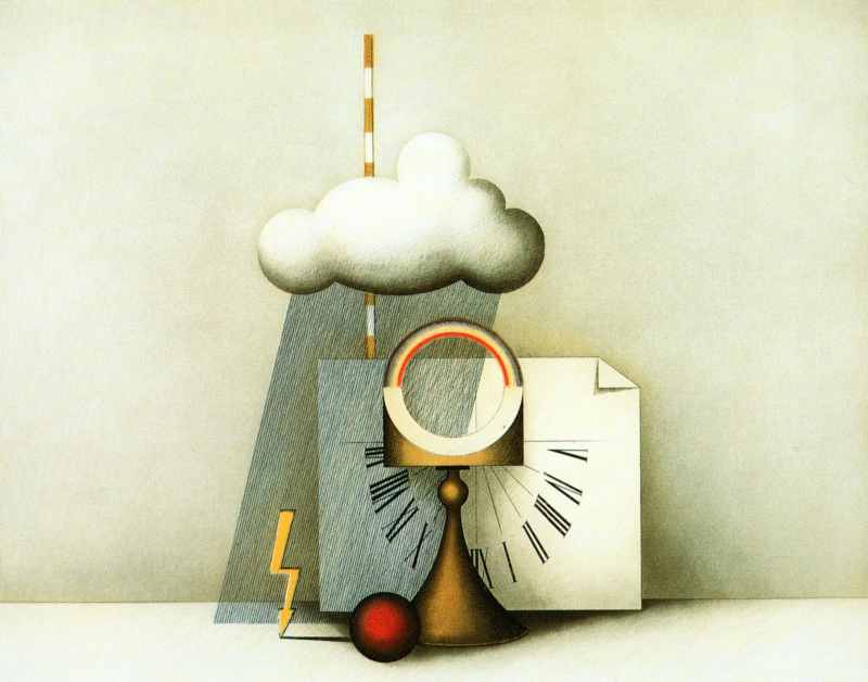 159. Meteorologisches Stilleben 1974 Format: 43 x 55 cm Strichätzung, Aquatinta, Kaltnadel, Sandpapier auf Kupfer.3 Platten, 5 Farben: gelb, rotgelb, rot, blau, schwarz. Auflage: 65 + LXXXV numerierte und signierte Exemplare, 20 als E.A. bezeichnete und signierte Exemplare Druck: Atelier Georges Leblanc, Paris Verlag: Propyläen Verlag, Berlin (arabisch numerierte Exemplare), Galerie Berggruen, Paris und Pantheon Presse, Rom (römisch numerierte Exemplare) Blatt 6 der Mappe "Nature Morte". |