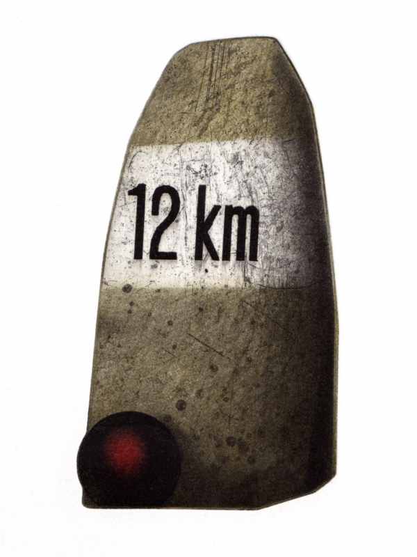 188. 12 km 1977 Format: 10 x 10.5 cm Strichätzung, Aquatinta auf Kupfer.2 Platten, 3 Farben: gelb, rot, schwarz. Auflage: 100 + XX numerierte und signierte Exemplare Druck: Herbert Jaeckel, Worpswede Verlag: Galerie Steinrötter, Münster Für das Mappenwerk "10 Jahre Galerie Steinrötter", mit den Künstlern: Helmut Bolle, Uwe Bremer, Horst Degenaar, Friedrich Meckseper, Pit Morell, Katinka Niederstrasser, Reimer Riediger, Ali Schindehütte, Wolfgang Troschke, Johannes Vennekamp, Marjan Vojska, Arno Waldschmidt und Frantz Wittkamp. Erschienen 1977 im Verlag der Galerie Steinrötter, Münster. |