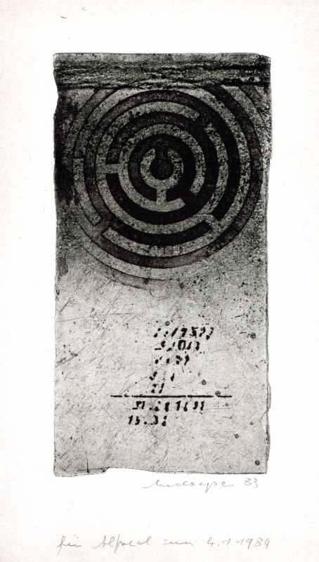 228. Labyrinth 1983 Format: 15 x 7.7 cm Aussprengtechnik, Aquatinta auf Kupfer und Zink.2 Platten, 2 Farben: grünschwarz, schwarz. Auflage: 50 numerierte und signierte Exemplare Druck: Heiner Bunte, Lilienthal Verlag: Bettina Wassmann, Bremen Beilage zu einem Text von Jochen Hörisch "Die Theorie der Verausgabung und die Verausgabung der Theorie". Erschienen 1983 im Verlag Bettina Wassmann, Bremen. |