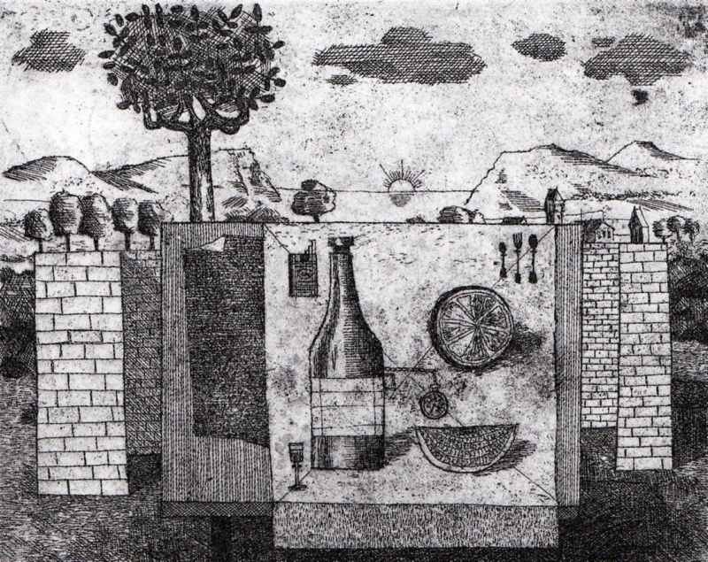 024. Stilleben mit Landschaft 1959 Format: 13 x 16 cm Strichätzung auf Zink.1 Platte, schwarz-weiss. Auflage: ca 5 nicht numerierte aber signierte Exemplare Druck: selbst |