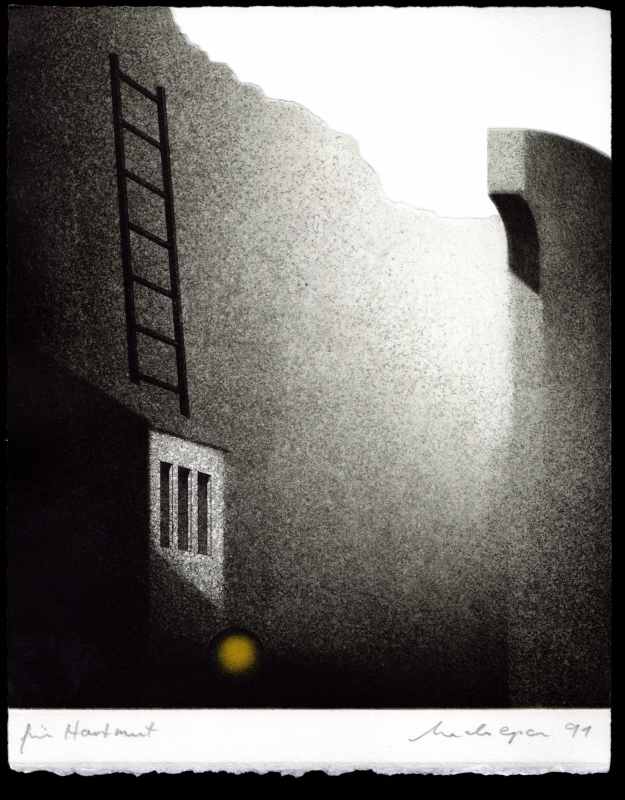 258. Im Schatten 1991 Format: 21.5 x 18.5 cm Aquatinta, Strichätzung, Roulette auf Kupfer.2 Platten, 3 Farben: gelb, graugrün, schwarz. Auflage: 150 + XX numerierte und signierte Exemplare Druck: Heiner Bunte, Lilienthal Verlag: Galerie Schmücking, Braunschweig Für die Vorzugsausgabe des Katalogs "Meckseper aus der Sammlung Grosshaus". Herausgegeben 1991 vom Städtischen Museum Braunschweig und der Galerie Schmücking, Basel / Braunschweig. Zusätzlich existieren 9 unterschiedliche, signierte Zustandsdrucke. |