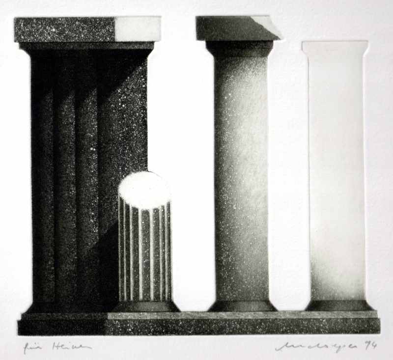 264. Ruinchen 1994 Format: 13.5 x 17.5 cm Aquatinta , Roulette auf Kupfer.1 Platte, schwarz-weiss. Auflage: 30 + X numerierte und signierte Exemplare Druck: Heiner Bunte, Lilienthal Verlag: Galerie Patrick Cramer, Genf Zusätzlich existieren 6 unterschiedliche, signierte Zustandsdrucke. |