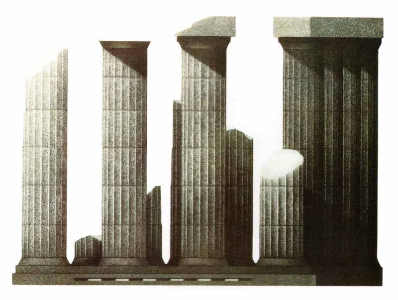 267. Zwölf Säulen 1994 Format: 39 x 54 cm Vernis mou, Aquatinta, Aussprengtechnik, Roulette, Moulette auf Kupfer.2 Platten, 2 Farben: blaugrün, grünschwarz. Auflage: 100 +XX numerierte und signierte Exemplare Druck: Heiner Bunte, Lilienthal Verla: Galerie Patrick Cramer, Genf Zusätzlich existieren 13 unterschiedliche, signierte Zustandsdrucke und 2 signierte Einzeldrucke der Platten. |