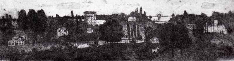 027. Landschaft 1959 Format: 9.5 x 34.5 cm Strichätzung auf Zink.1 Platte, schwarz-weiss. Auflage: ca 5 nicht numerierte aber signierte Exemplare Druck: selbst |