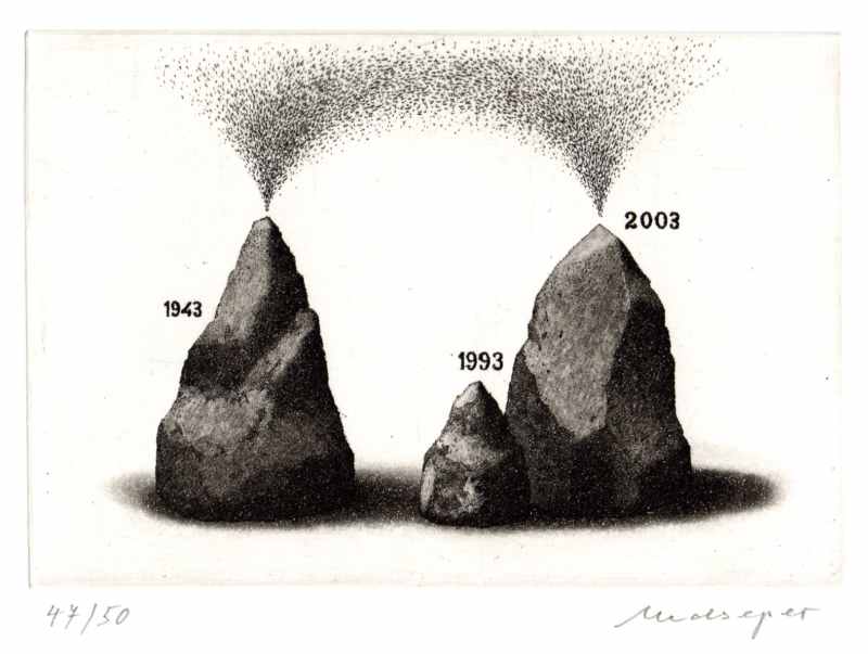 277. Evolution 2003 Format: 8.5 x 12.5 cm Strichätzung, Kaltnadel, Aquatinta auf Kupfer,1 Platte, schwarz-weiss. Auflage: 50 numerierte und signierte Exemplare Druck: Heiner Bunte, Lilienthal Privatdruck für William-Henri Sunier Zusätzlich existieren 4 unterschiedliche, signierte Zustandsdrucke. |