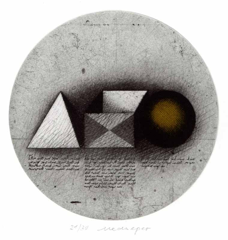 279. Kleines Dreierlei 2003 Format: 12 x 12 cm Strichätzung, Vernis mou, Kaltnadel, Aquatinta auf Kupfer.2 Platten, 3 Farben: gelb, blaugrau, schwarz Auflage: 30 + X numerierte und signierte Exemplare Druck: Heiner Bunte, Lilienthal Verlag: Galerie Peerlings, Krefeld Verwendet wurden die überarbeiteten und in Kreisform gebrachten Platten der Katalognummer 127, Kleines Dreierlei, 1970. Zusätzlich existieren 5 unterschiedliche, signierte Zustandsdrucke. |