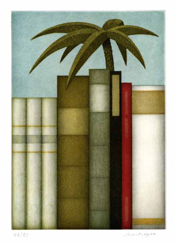 285. Kleine Bibliothek 2007 Format: 18 x 12.8 cm Strichätzung, Aquatinta auf Kupfer4 Platten, 4 Farben: grünschwarz, gelb, rot, blau Auflage: 80 + X numerierte und signierte Exemplare Druck: Heiner Bunte, Lilienthal Verlag: Galerie Steinrötter, Münster und Galerie Peerlings, Krefeld Zusätzlich existieren 11 unterschiedliche signierte Zustandsdrucke. |