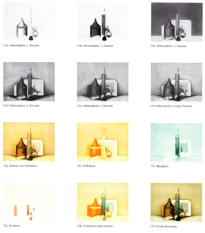 131. Eine Radierung 1971 11 Zustandsdrucke und eine fertige Radierung Nr. 131 inderen Techniken und Farben Auflage: XXXV numerierte und signierte Exemplare Druck: Herbert Jaeckel, Worpswede und Druckgrafik Kätelhön, Wamel Verlag: Galerie Schmücking, Braunschweig Erschienen als Mappenwerk "Eine Radierung" (siehe Nr.131) |