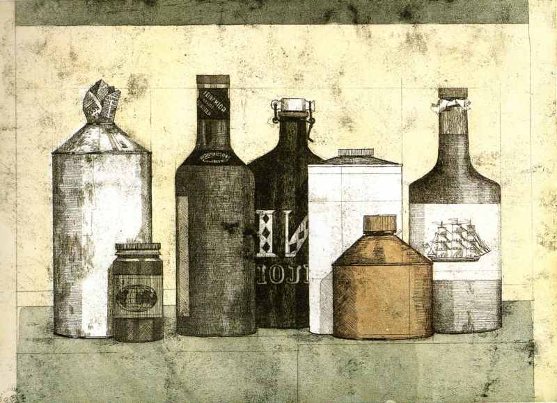 030. Flaschen 1959 Format: 38 x 53.5 cm Strichätzung, Aquatinta auf Zink.2 Platten, 4 Farben: blau, gelb, orange, schwarz Auflage: 30 numerierte und signierte Exemplare Druck: selbst und Otto Felsing, Berlin. |