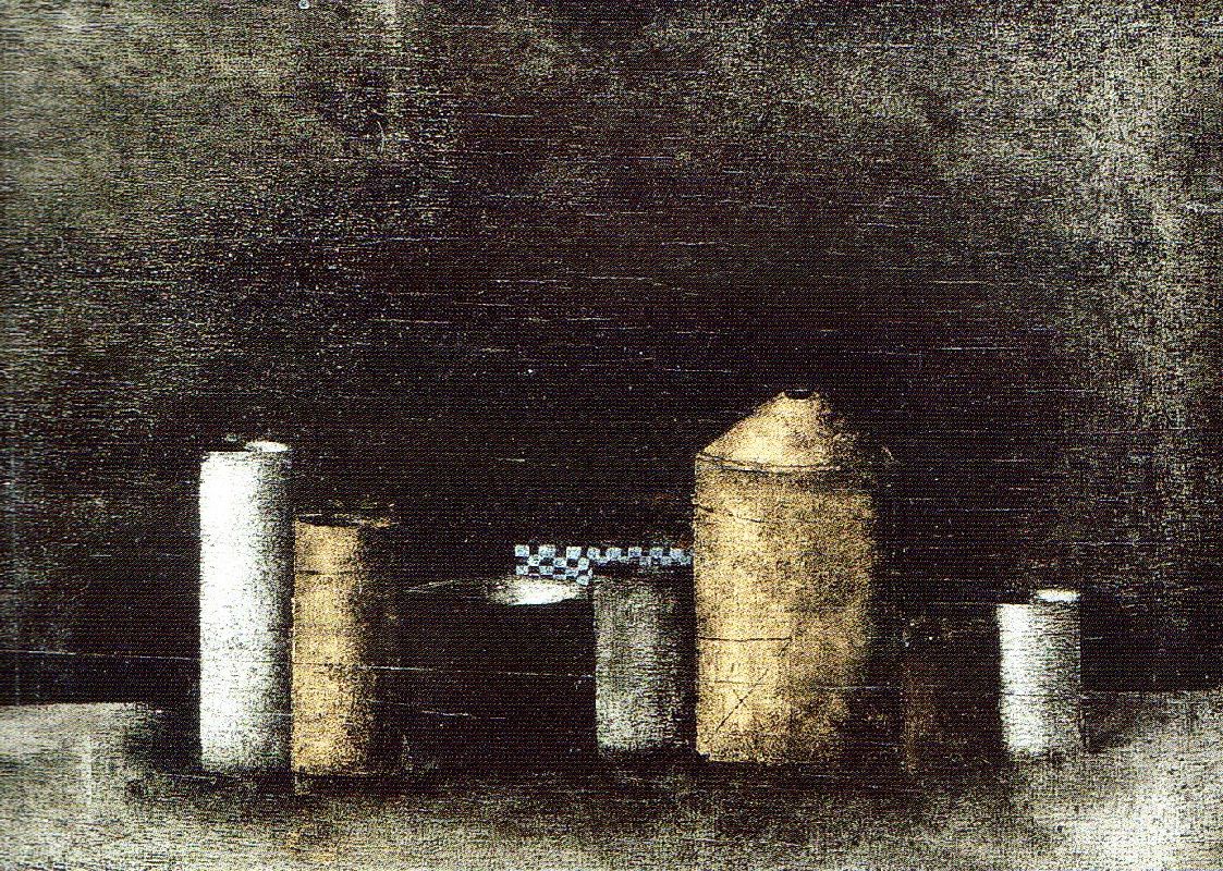 018. Sieben Dosen 1962 Format: 20.5 x 29 cm Öl und Blattgold auf Hartfaser |