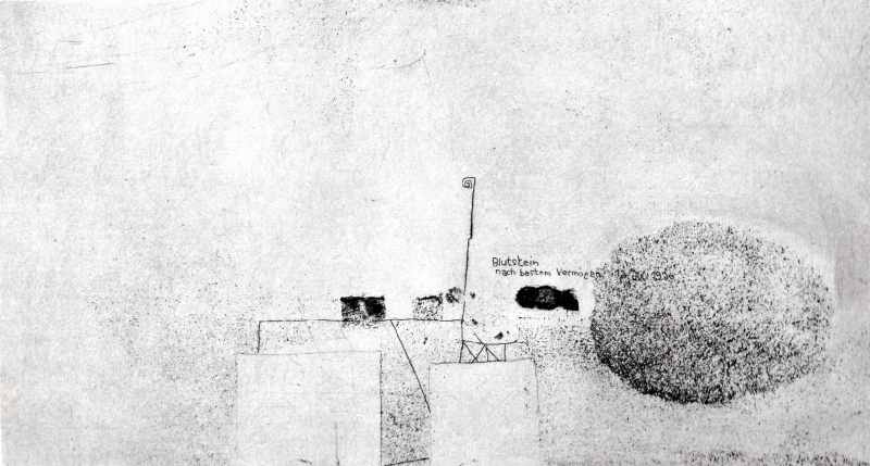 035. Blutstein 1960 Format: 12 x 21 cm Strichätzung, Frottage auf Zink.1 Platte, schwarz-weiss. Auflage: 20 numerierte und signierte Exemplare Druck: Herbert Jaeckel, Worpswede |