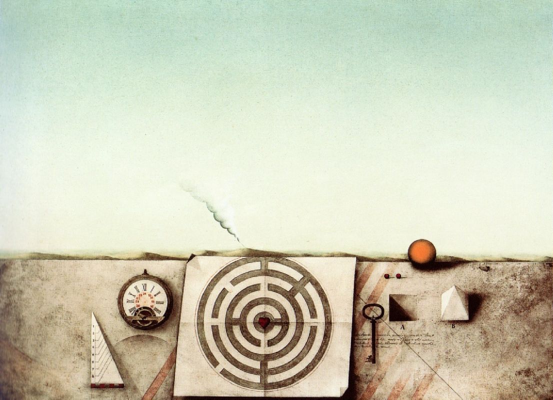 056. Labyrinth und Landschaft 1965 Format: 57.5 x 79.5 cm Öl auf Hartfaser |