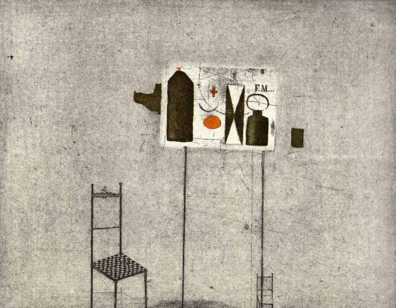 047. Tisch mit Stühlen 1962 Format: 35 x 45 cm Strichätzung, Aquatinta, Sandpapier auf Zink.2 Platten, 4 Farben: graugrün, orange, rot, schwarz. Auflage: 20 numerierte und signierte Exemplare Druck: selbst |