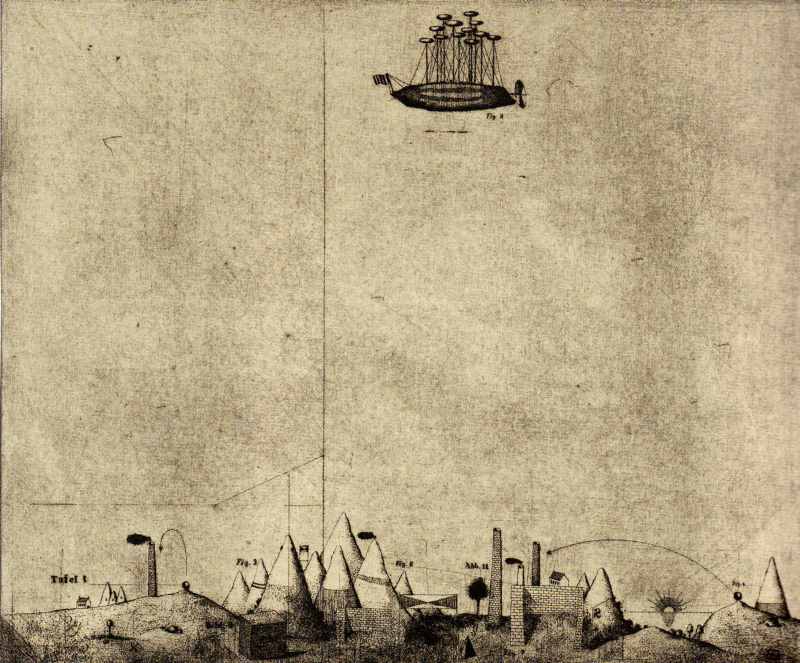 051. Luftschiffer Giannozzo 1962 Format: 50 x 60 cm Strichätzung, Sandpapier auf Zink2 Platten, 2 Farben: sepia, schwarz Auflage: 10 numerierte und signierte Exemplare Druck: selbst |