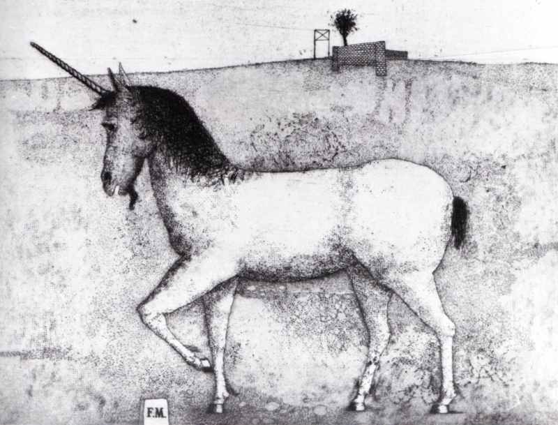 052. Einhorn 1962 Format: 40 x 50 cm Strichätzung, Kaltnadel, Frottage auf Zink1 Platte, schwarz-weiss. Auflage: 20 numerierte und signierte Exemplare Druck: selbst und Georg und Wilhelm Schneider, Berlin |