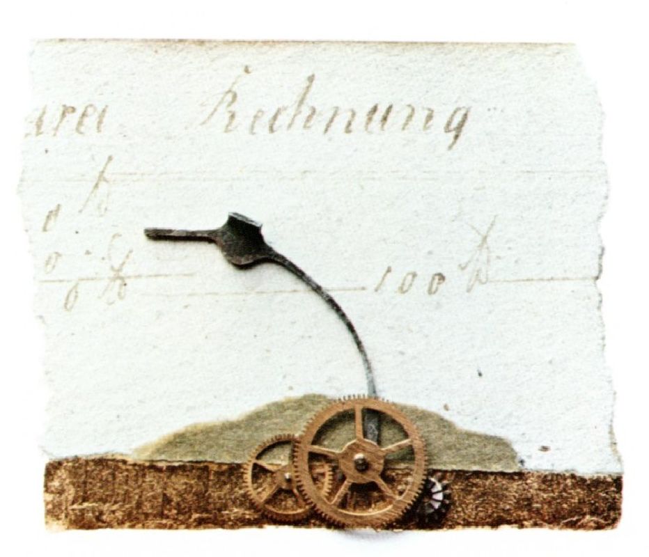 026. Rechnung 1977 Format: 18 x 13 cm verschiedene Materialien, 5.3 x 6.3 cm, auf weiss grundiertem Holz |