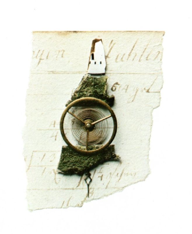 036. Firlefanz 1978 Format: 18 x 13 cm verschiedene Materialien, 6.5 x 5 cmauf weiss grundiertem Holz. |