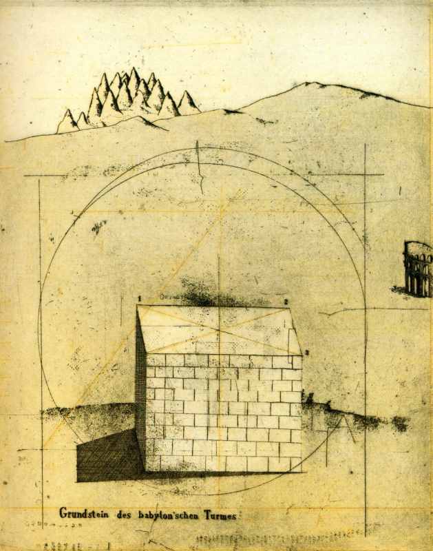054. Grundstein des babylon'schen Turmes 1962 Format: 50 x 40 cm Strichätzung, Sandpapier auf Zink2 Platten, 2 Farben: gelb, schwarz. Auflage: 20 numerierte und signierte Exemplare Druck: selbst |