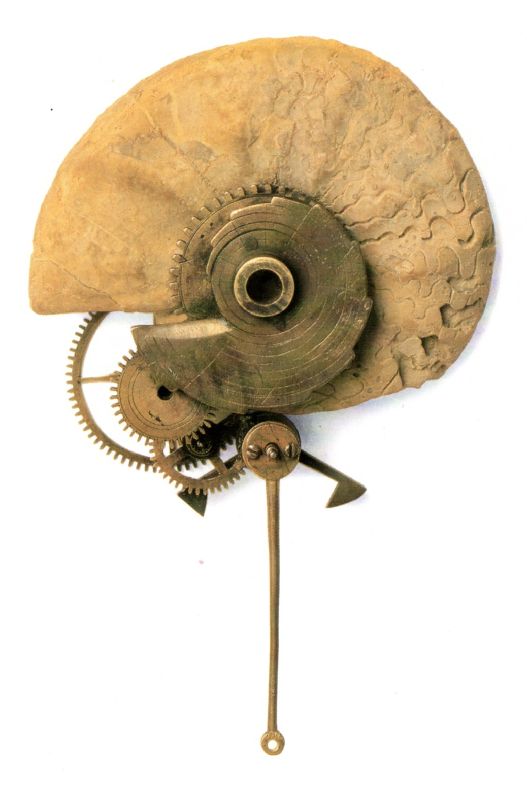 051. Mechanischer Ammonit 1981 Format: 18 x 13 cm verschiedene Materialien, 12 x 8 cm auf weiss grundiertem Holz. |