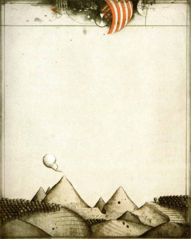 066. Landschaft 1965 Format: 50 x 40 cm Strichätzung, Kaltnadel, Aquatinta, Roulette, Sandpapier auf Kupfer.3 Platten, 4 Farben: blaugrün, grüngrau, rot, schwarz Auflage: 65 numerierte und signierte Exemplare. Druck: Willy Steinert, Weingarten Verlag: Edition Rothe, Heidelberg |