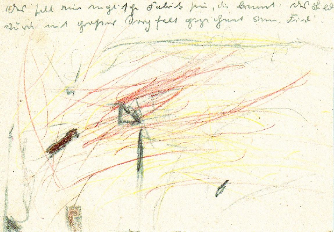 00001. Brennende englische Fabrik 1941 Format: 10 x 15 cm Buntstift auf Postkarte, rückseitig signiert |