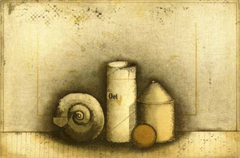 073. Stilleben 1965 Format: 22 x 32.5 cm Strichätzung, Aquatinta, Kaltnadel, Roulette auf Kupfer.2 Platten, 2 Farben:gelb, schwarz Auflage: 100 numerierte und signierte Exemplare und ca. 10 nicht numerierte aber signierte Exemplare. Druck: Georg und Wilhelm Schneider, Berlin Verlag: Kunstverein Braunschweig Jahresgabe 1965 des Kunstvereins Braunschweig. |