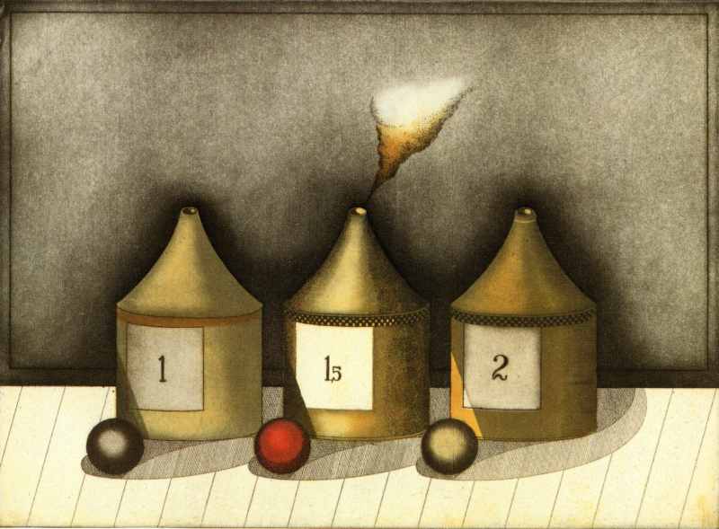 087. Drei Flaschen 1967 Format: 36.5 x 50 cm Strichätzung, Aquatinta, Kaltnadel, Sandpapier auf Kupfer.2 Platten, 3 Farben: rotgelb, rot, schwarz. Auflage: 75 + X numerierte und signierte Exemplare Druck: Willy Steinert, Weingarten Verlag: Edition Rothe, Heidelberg |