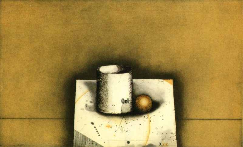 095. Oel 1967 Format: 22.5 x 36.5 cm Strichätzung, Aquatinta, Sandpapier auf Kupfer.2 Platten, 2 Farben: rotgelb,schwarz. Auflage: 120 numerierte und signierte Exemplare. Druck: Willy Steinert, Weingarten Ein Teil der Auflage wurde als Jahresgabe 1967 des Kunstkreises Hameln verwendet. |