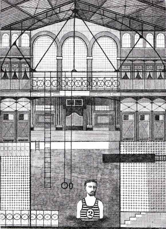 012. John im Bade 1957 Format: 48 x 35 cm Strichätzung auf Zink.1 Platte, schwarz-weiss Auflage: ca 8 nicht numerierte aber signierte Exemplare Druck: selbst |